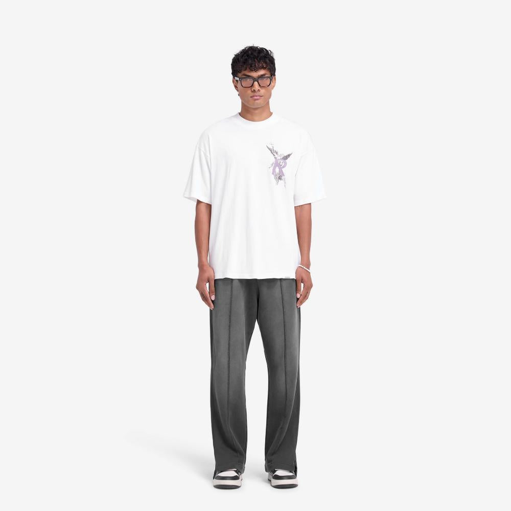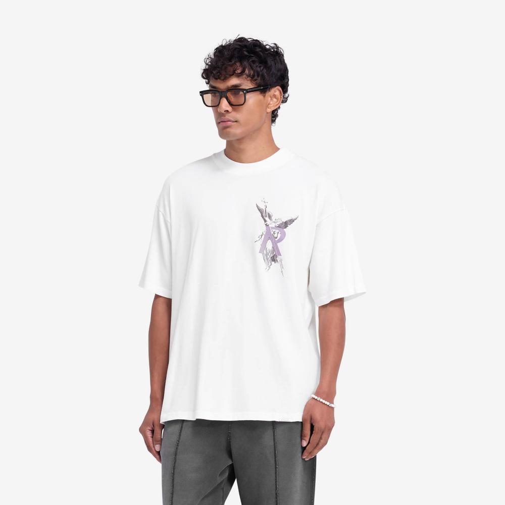 Introducing the Archangel T-Shirt in Flat White, a slightly oversized t-shirt. The t-shirt showcases our textured high density screen printed Archangel graphic to the front and back, and a Represent metal bar logo to the hem.
